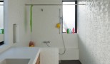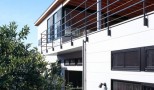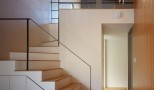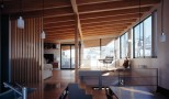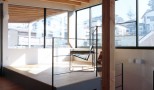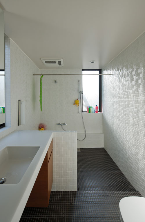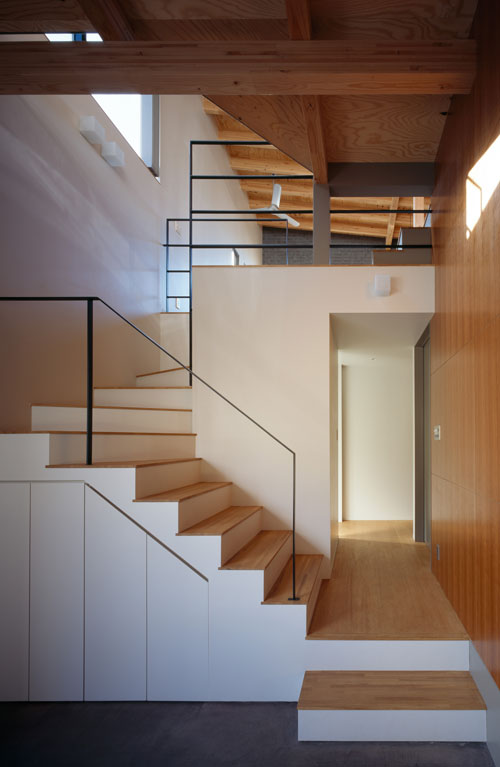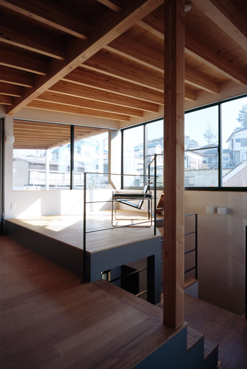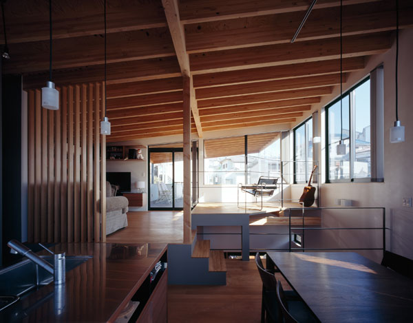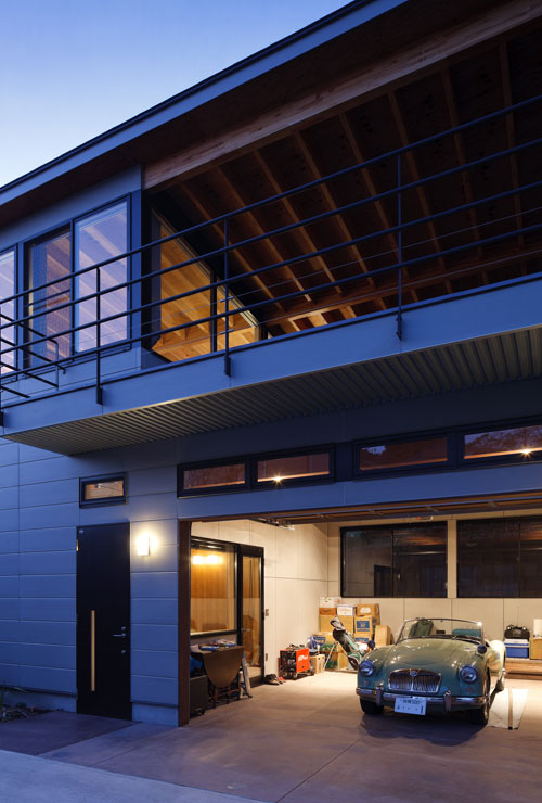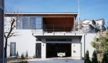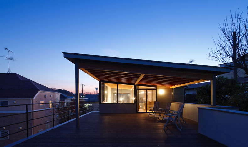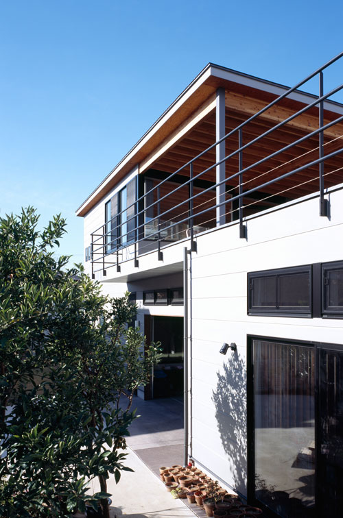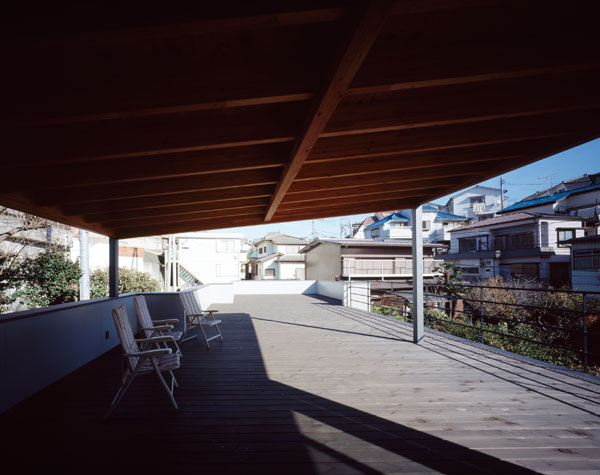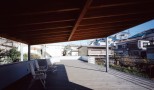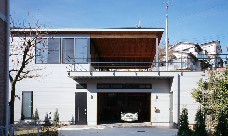 平屋の親世帯住戸と2階建ての子世帯住戸をガレージを中心にして連結した二世帯住宅です。親世帯とガレージの屋根の高さを合わせて、船の甲板のような広々としたウッドデッキをつくりました。この場所は子世帯2階のリビングから連続した半外部空間となっており、室内の延長として様々な用途に利用できます。両世帯にはさまれたガレージはご主人の趣味である車いじりが存分に楽しめる場所であるとともに、親世帯とのちょうどよい距離を保つ緩衝地帯としてコミュニケーションの場ともなっています。