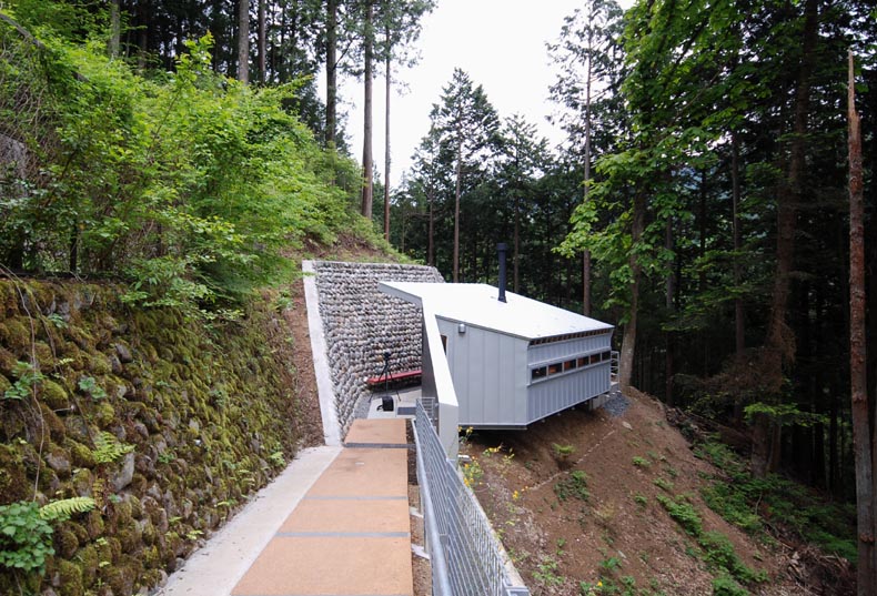 奥多摩町が運営する森林を活用したメンタルセラピーのためのトレイルの計画。その中に休憩や様々な活動の拠点として機能する三つのステーションを設計しました。それぞれの施設は小さな木造のあずまやといった趣きの建物で、ランドスケープとの一体感を大切に計画されています。内部空間は開放的でありながらも、室内に入った際に包みこまれるような安心感を覚えることができるように大きな屋根に覆われ、メンタルセラピーの効果を最大限高めることができる空間となっています。