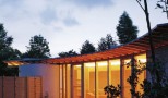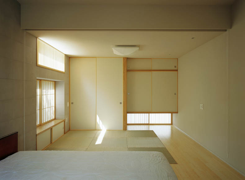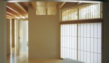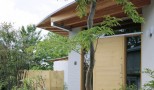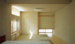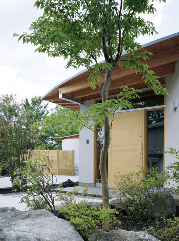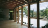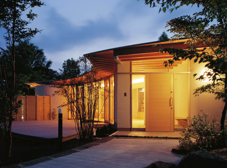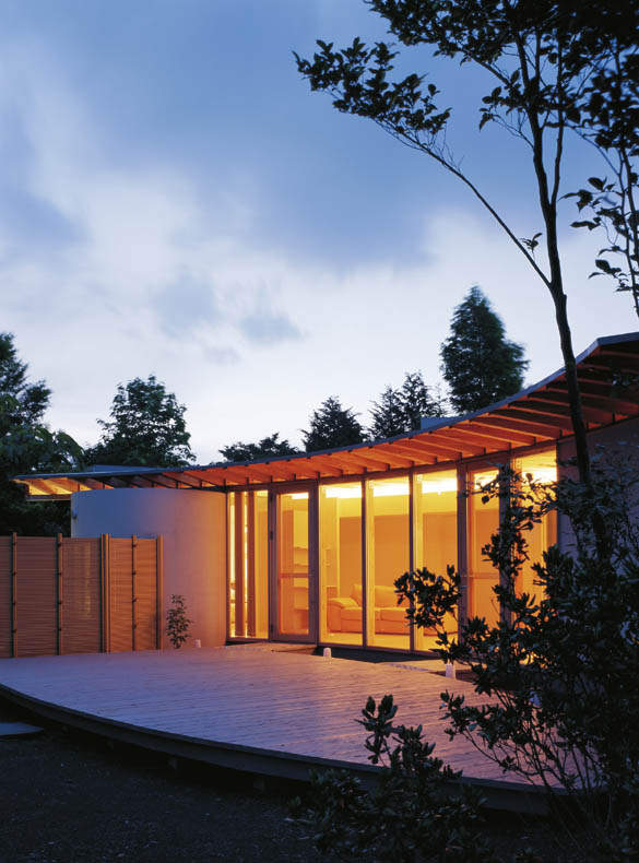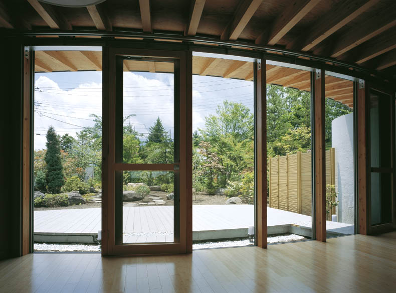 富士山をのぞむ大きな敷地に建つ、高齢者夫婦とその娘さんのための、バリアフリーに配慮した完全フラットな平屋の住宅です。 緩やかなアールを描く開放的な建て物で、家中どこからでも富士山の眺めを楽しむことができます。内部は高齢の家族が互いの気配を感じることができるワンルームとし、必要に応じて空間を仕切ることのできる建具を設けています。すべて開放した状態でも、湾曲した空間が適度に視線を遮ることでプライバシーが確保できるようになっています。
